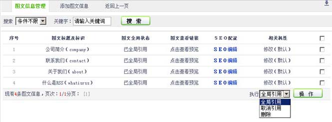 1.在“搜索”字段,搜索特定的某条图文,以便进行管理。2.在“图文信息管理”, 设置图文的SEO配置、修改、是否全局引用,删除等操作。
