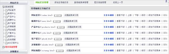 在栏目列表中可以对栏目进行(隐藏、设置幅菜单是否引用、栏目SEO编辑、上下移动、修改、添加下级菜单删除等操作),(系统默认栏目无法删除,只能移动或是隐藏)。